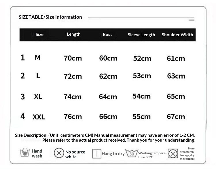 1. Asian sizes are 1 to 2 sizes smaller than European and American people. Choose the larger size if your size between two sizes. Please allow 2-3cm differences due to manual measurement. 2. Please check the size chart carefully before you buy the item, if you don't know how to choose size, please contact our customer service. 3.As you know, the different computers display colors differently, the color of the actual item may vary slightly from the following images.