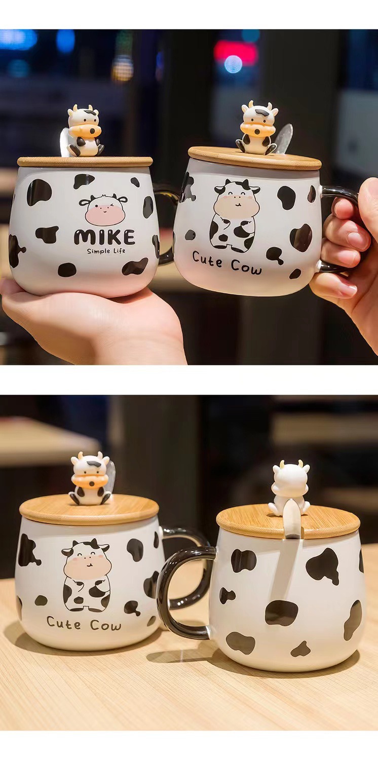 Cartoon ceramic water cup cute cow mug high value coffee mug milk mug student couple mug with lid