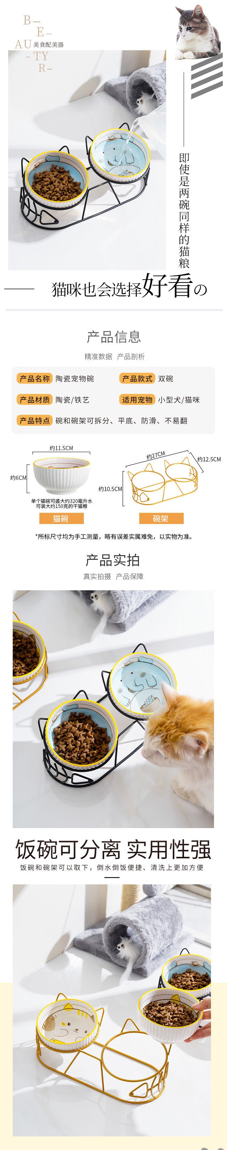 Cat bowl, ceramic bowl, double bowl, cat food bowl, dog bowl, pet cat food and water fixing rack, protect the cervical spine from overturning