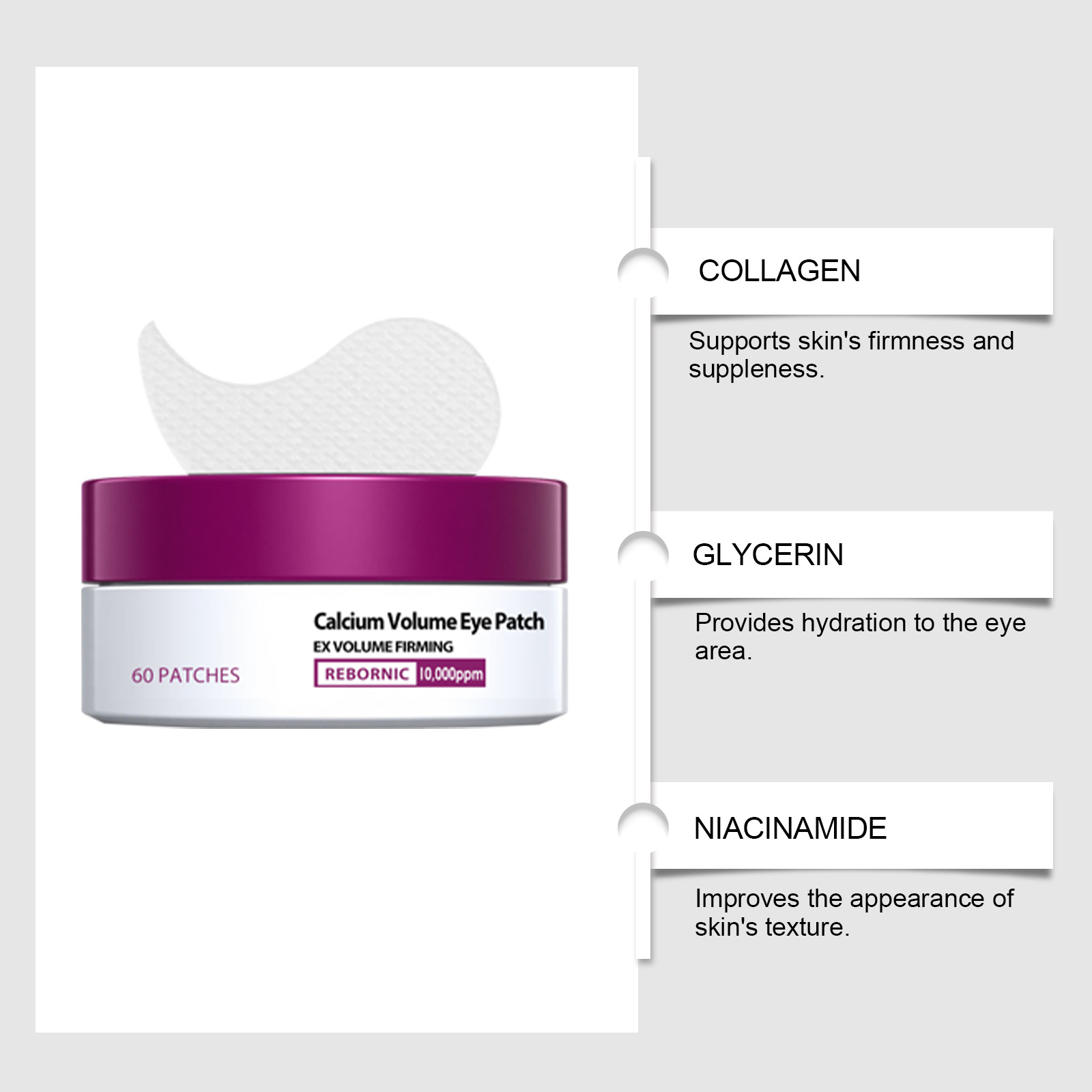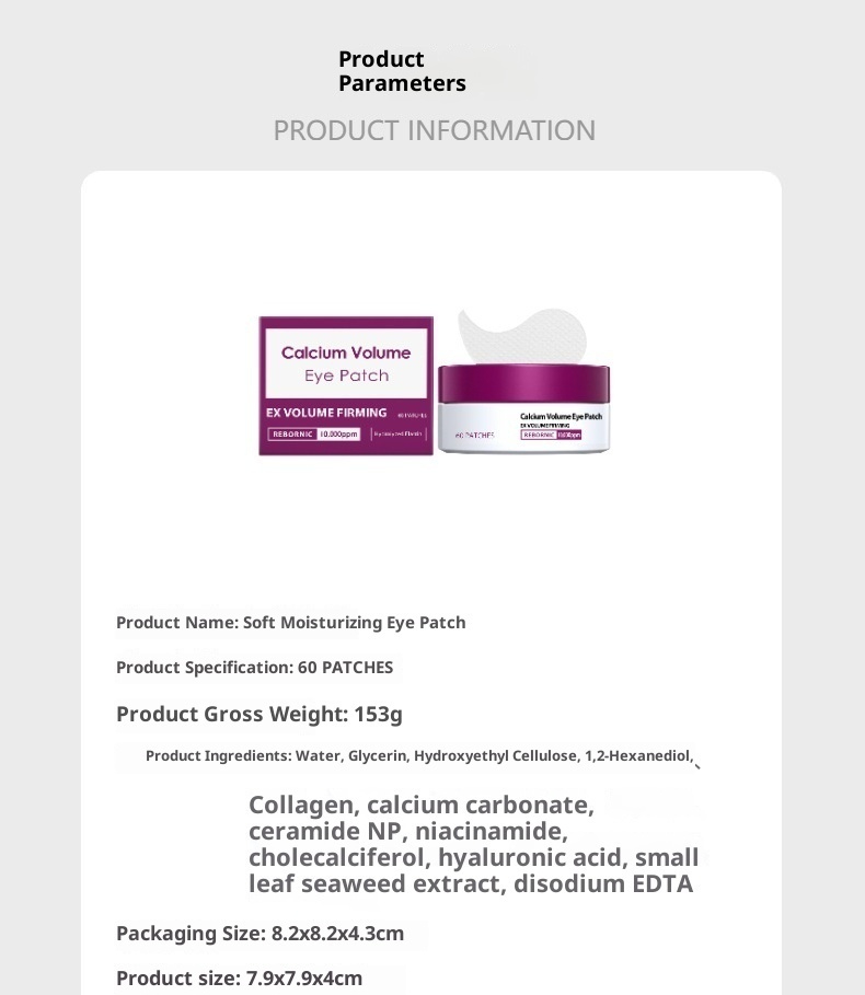 Product information:Makeup tool category: Other makeup/beauty tools Target audience: Public Size: Packaging size: 8.2x8.2x4.3cm Color classification: 60 patches Net content: 60 patches Product ingredients: Water, glycerin, hydroxyethyl cellulose, 1,2-hexanediol, collagen, calcium carbonate, ceramide NP, niacinamide, cholecalciferol, hyaluronic acid, sargassum fusiforme extract, disodium EDTA