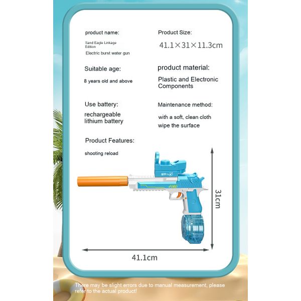 Product information: Color: sand Eagle linkage version-pure blue, sand Eagle linkage version-pure gray, sand Eagle linkage version-translucent blue, sand Eagle linkage version-transparent Gray Specification: 41.1*31 * 11.3cm Function: electric continuous AMT Material: Plastic Packing method: Color box Category: Water toys