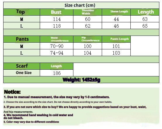 Packing list: Suit x 1 (Top+Pants+Scarf)