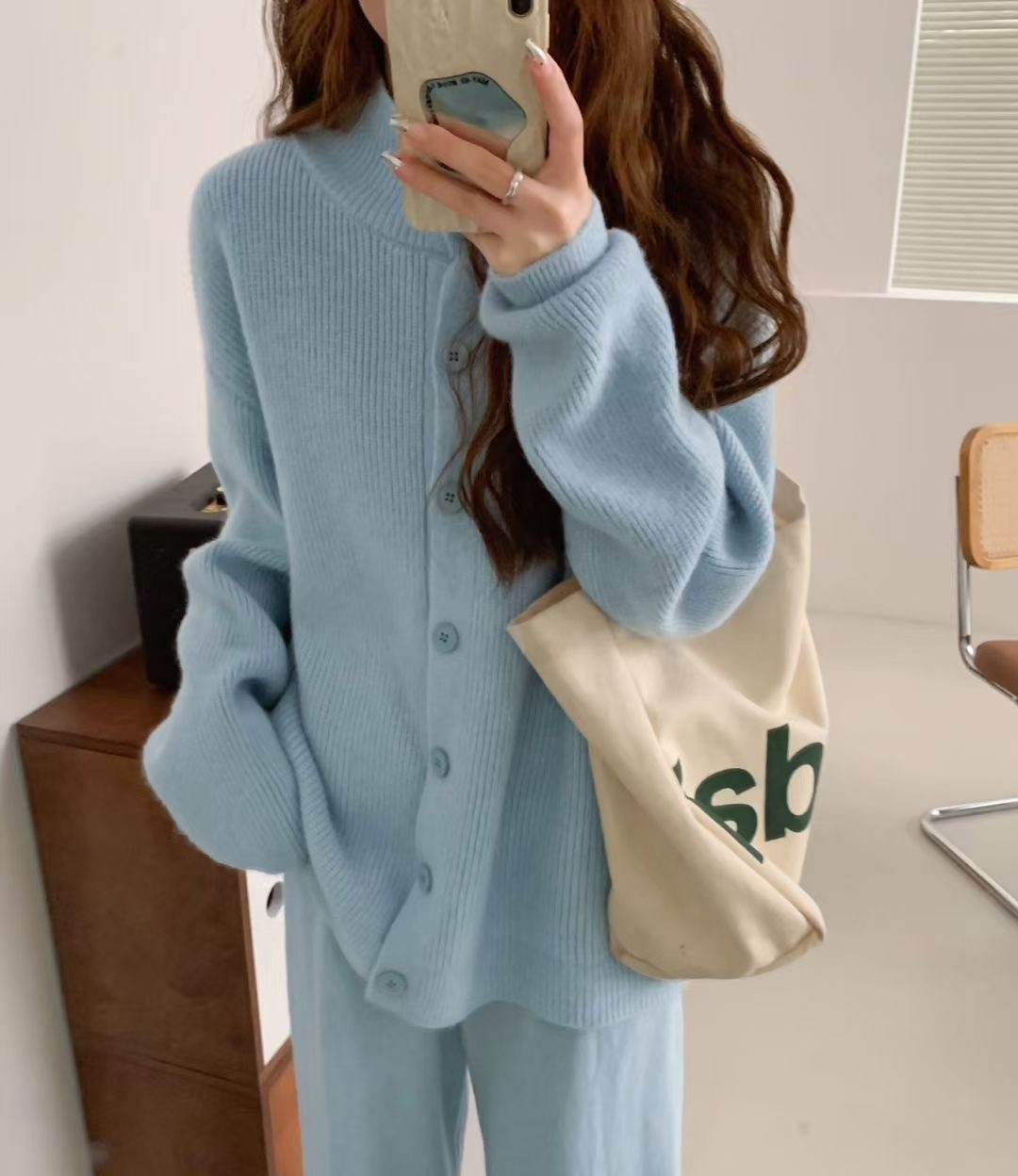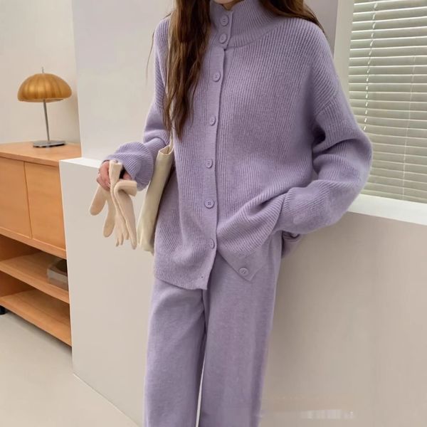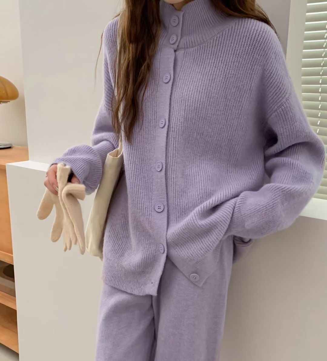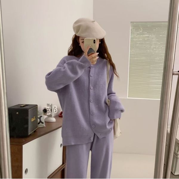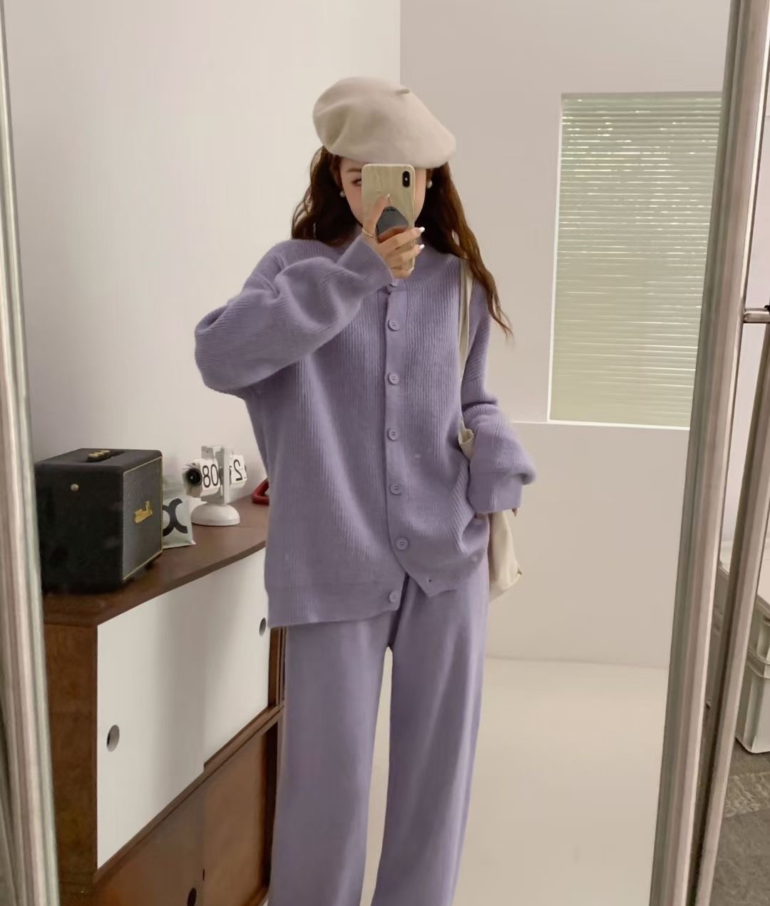 Product information: Pattern: solid color Color: milky white, sky blue, purple, dark gray Pants length: trousers Size: average size Style type: Japanese and Korean casual Popular elements: solid color Fabric name: Cashmere Sleeve type: regular sleeve Main fabric composition: acrylic fiber Applicable Gender: Female Sleeve length: long sleeve Style: casual style Craft: collage/stitching