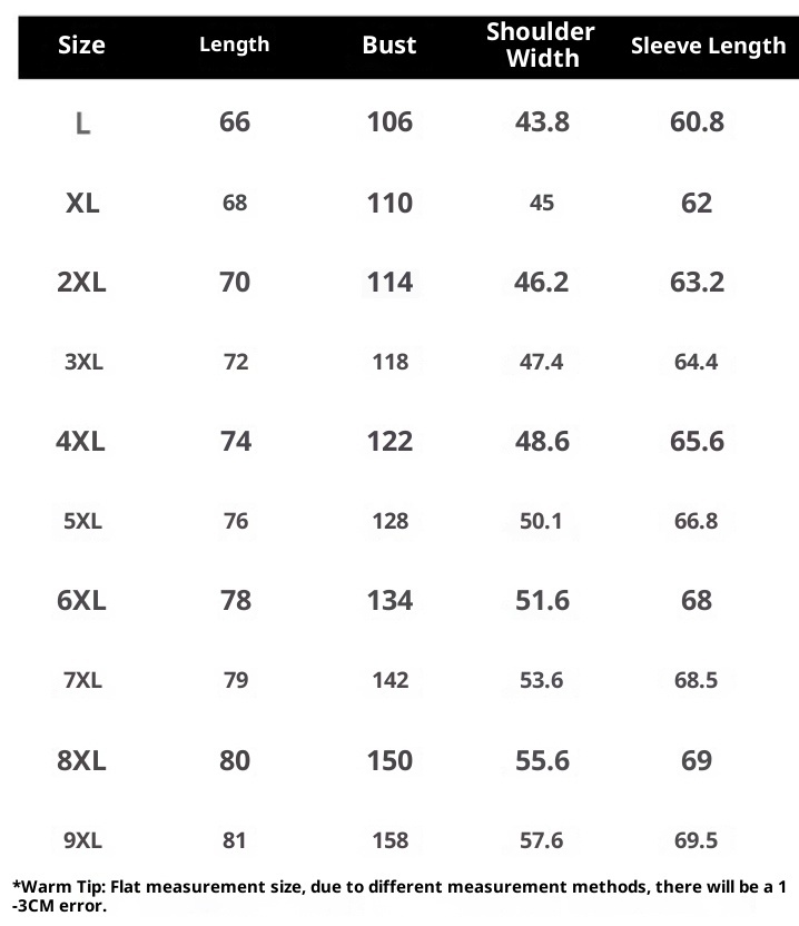Size: L, XL, 2XL, 3XL, 4XL, 5XL, 6XL, 7XL, 8XL, 9XL