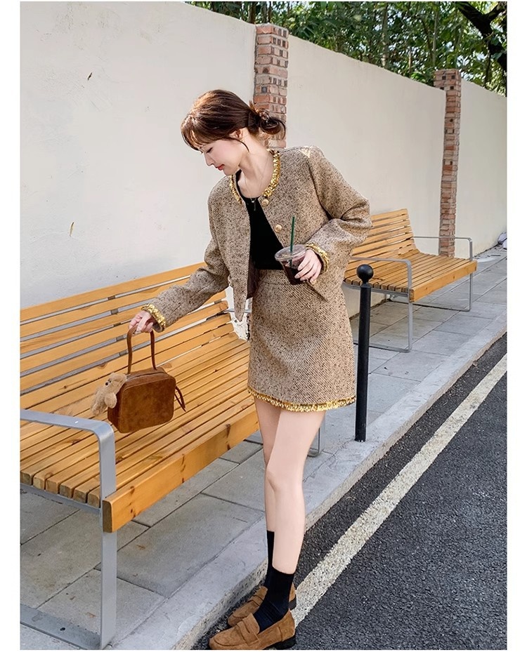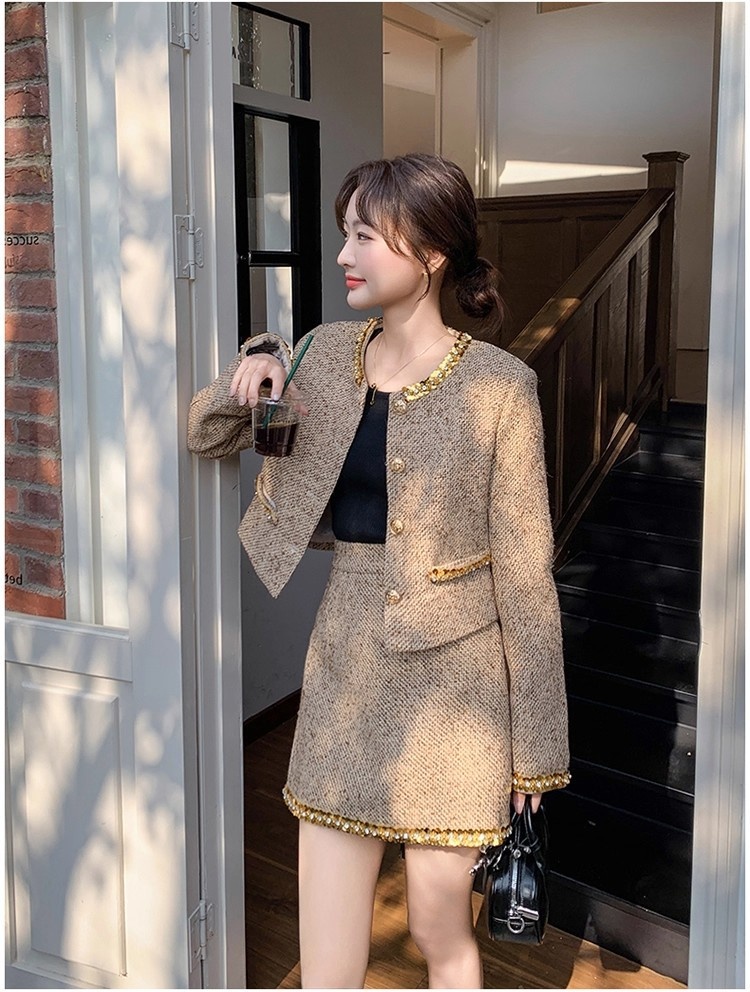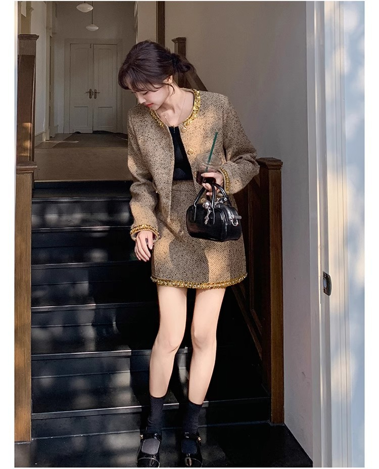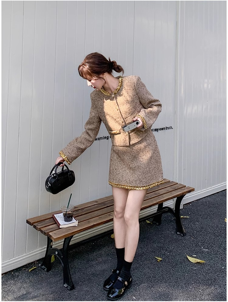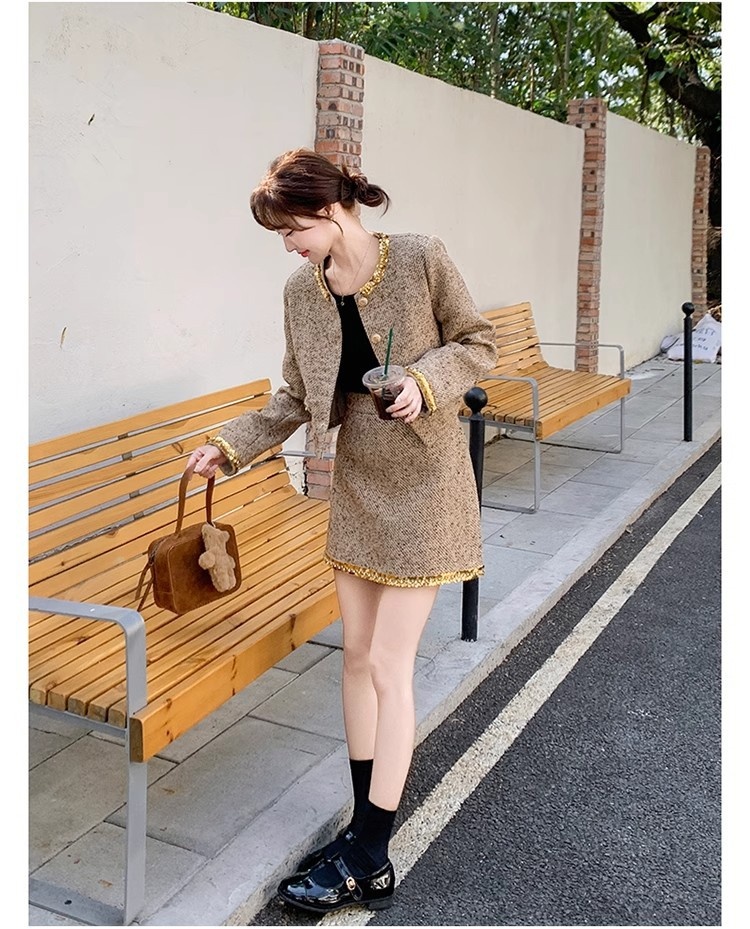 Product information: Pattern: color matching Color: golden brown (skirt), golden brown (coat), golden brown (suit) Size: S,M,L,XL Main fabric composition: Polyester Applicable Gender: Female Style: classic style Craft: embossing