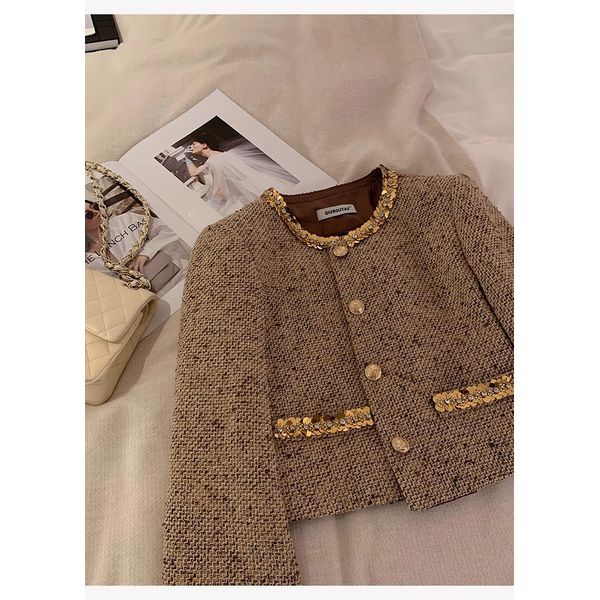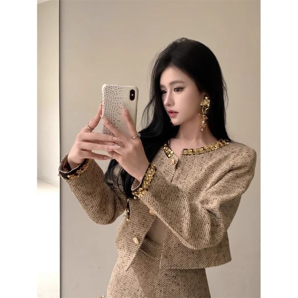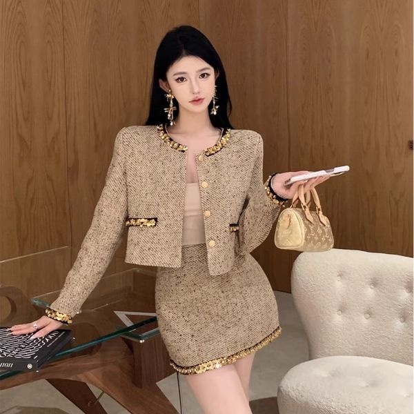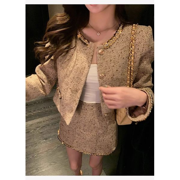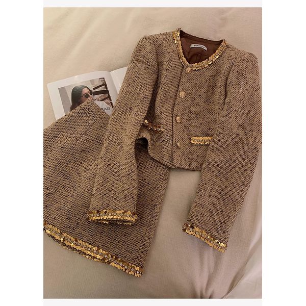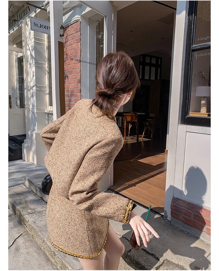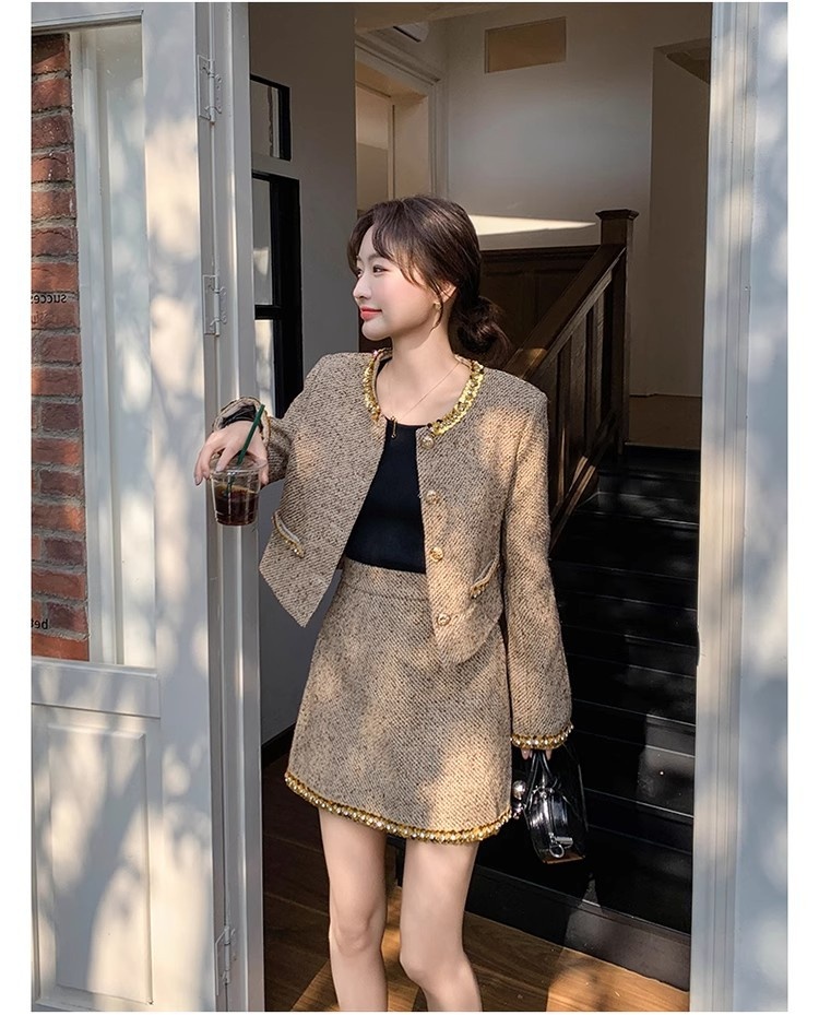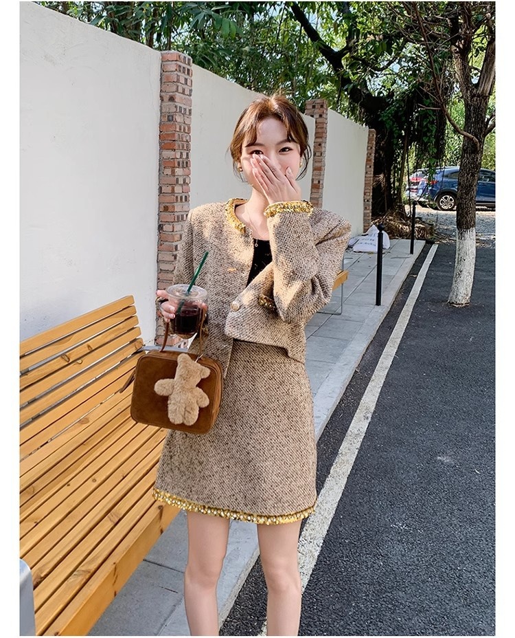 Product information: Pattern: color matching Color: golden brown (skirt), golden brown (coat), golden brown (suit) Size: S,M,L,XL Main fabric composition: Polyester Applicable Gender: Female Style: classic style Craft: embossing